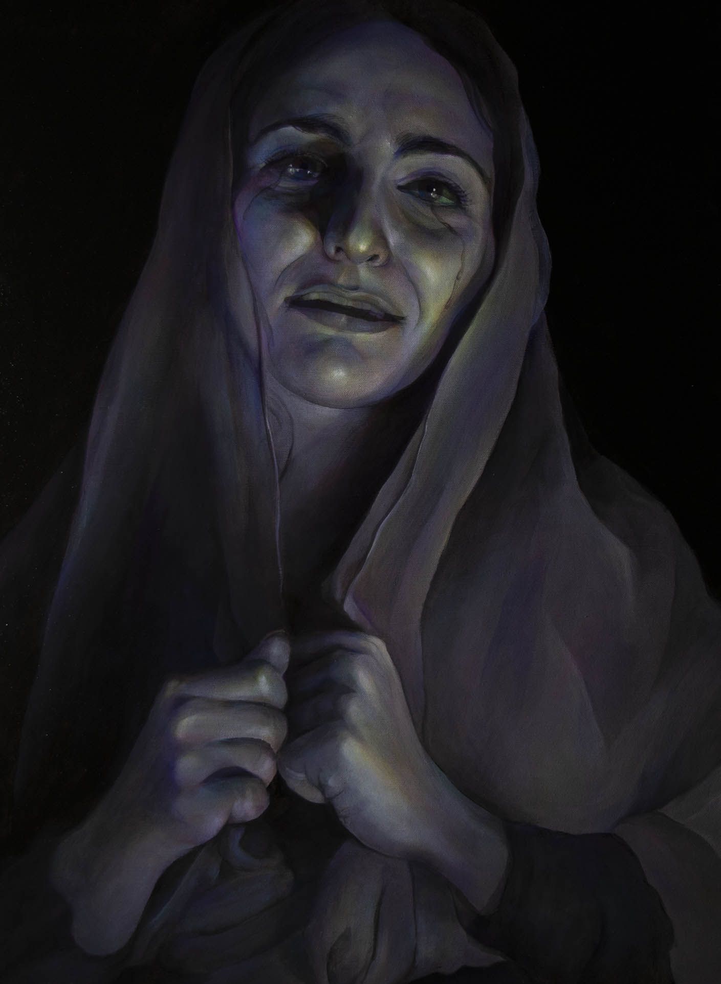 Maria, forza passiva nell’enneagramma, subisce la passione e la morte del figlio. Rappresenta l’umanità che si trasforma passando da una comprensione superficiale della morte (come qualcosa di immanente e definitivo) ad una nuova concezione della morte come apparente manifestazione fenomenica di una realtà altrettanto illusoria. Su un piano di lettura più vicino, la Madonna che piange è per la società cattolica l’emblema del miracolo, ma cosa accade se qualcuno rivela che il miracolo è indotto artificialmente? L’osservatore passa da una consapevolezza solo superficiale, sensazionalistica, ad una comprensione più profonda e finalmente autentica: dietro il miracolo c’è un pianto di dolore, lo stesso pianto di un neonato che ha appena aperto gli occhi sulla vita.